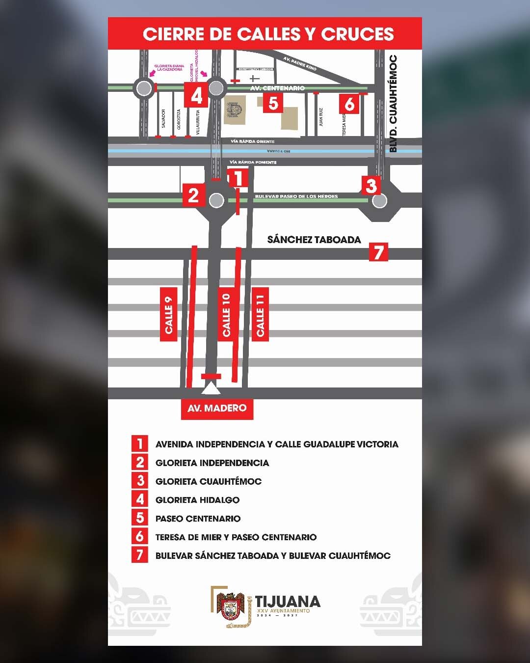 Tijuana, Baja California, a 19 de noviembre de 2025. El gobierno del presidente municipal Ismael Burgueño Ruiz, informa a la comunidad que con motivo del Desfile Cívico del Aniversario de la Revolución Mexicana, se contempla el cierre de diversas vialidades de la Zona del Río y Centro, a partir de las 06:00 horas de mañana jueves 20 de noviembre.
