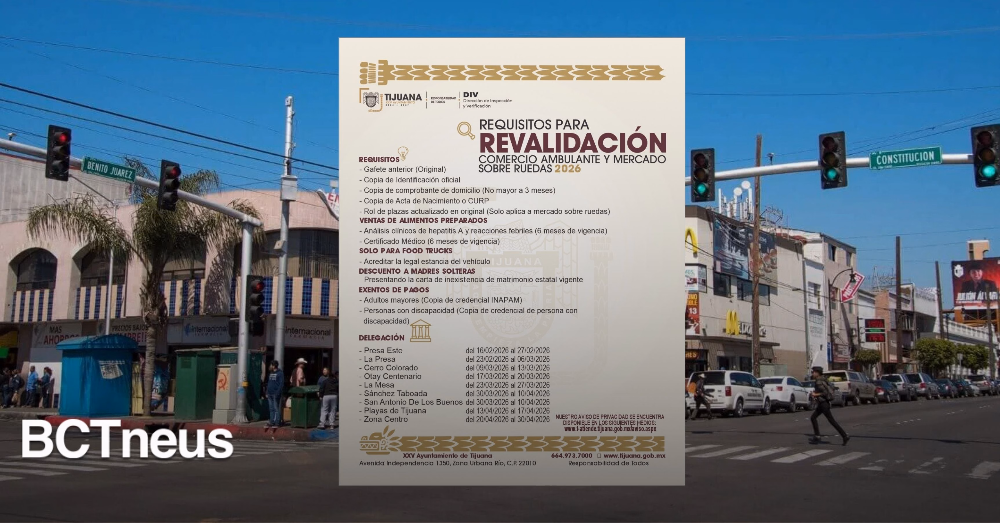 Tijuana, Baja California, a 15 de febrero de 2026.- Con el objetivo de mantener el orden en el comercio de la ciudad, el gobierno del presidente municipal, Ismael Burgueño Ruiz, a través de la Dirección de Inspección y Verificación, iniciará este lunes 16 de febrero con el programa de Revalidación de Permisos para Comercio Ambulante y Mercados Sobre Ruedas 2026.